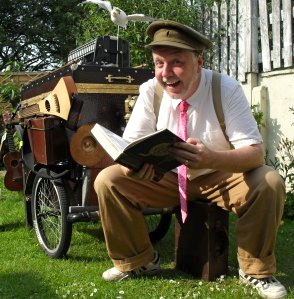 Gacko is the Royal Troubadour of Piel Island. Proudly promenading with Dolly, his peripatetic perambulator of performance. Ever ready to unload his curious cargo of songs, stories and routines, this wandering vagabond showman explores the nooks and crannies of your event, festival or resort.